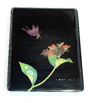 文箱「紫陽花に蝶」 34.3p×25p×6.2p(高さ) 問い合わせ先:漆工芸なかたに TEL:0768-22-7393 |