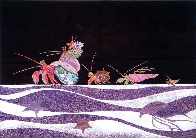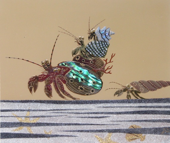 ![]() 第48回輪島塗り見本展出品作「おさんぽ」 完売 パネルサイズ13.6p×12.1p ※是非ヤドカリたちの細かな表情を楽しんでみて下さいね。 |