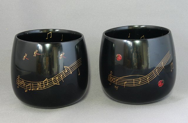 | カップの中にも楽譜を飛ばしました。それからひっくり返すともう一匹トンボとテントウ虫が隠れています。 |