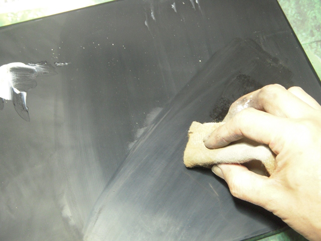 | 7 | 艶上げ | 器物(パネル)全体にに生漆を薄く引き拭き取り湿箱で乾燥。その後艶上げようの粉末を使い艶を上げていきます。この作業は2回から3回と表面が鏡面になるまで続けます。 | ||