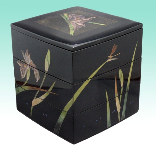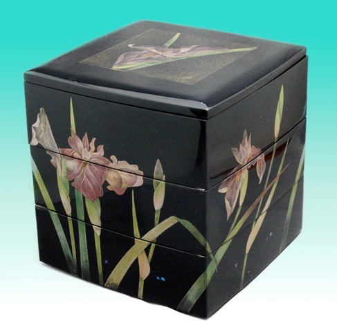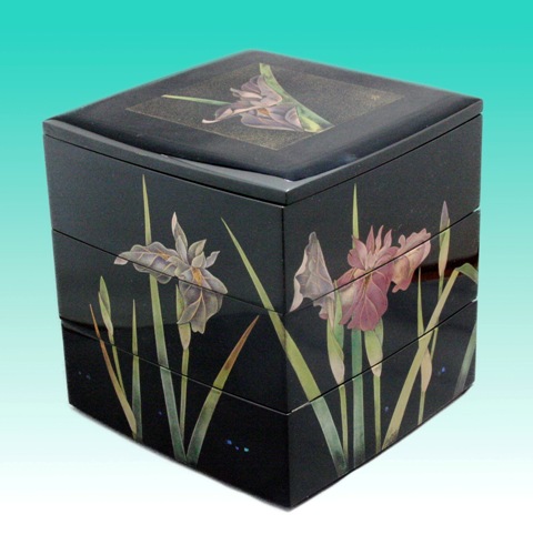 花菖蒲をモチーフに重箱・吸い物椀・茶托・銘々皿のセットをご注文頂きました。